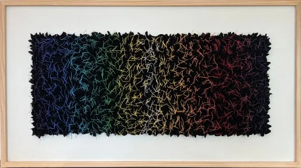 I create images in primarily three ways. On wood, (usually yardsticks), combining acrylic, enamel, and other materials. Although I don't consider myself a fiber artist, I also work with fabric and varnished crochet thread to create a variety of images. My most current work combines the time-honored techniques of papermaking and mosaic with today's technology of digital photography to create mosaics from hand-cast paper cubes. These mosaics seem to have two realities — a colorful abstract when viewed close and photographic reality when viewed from a distance.