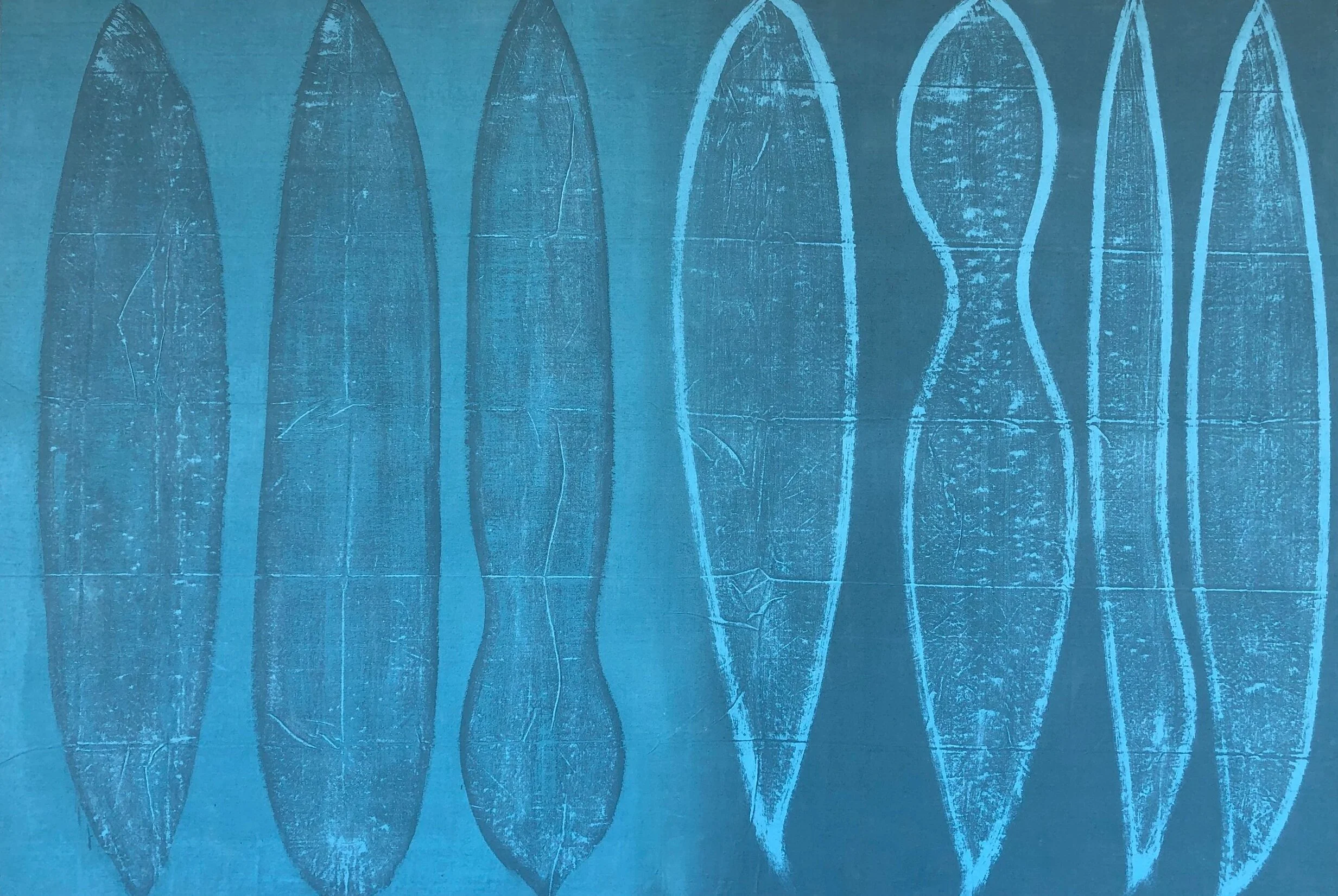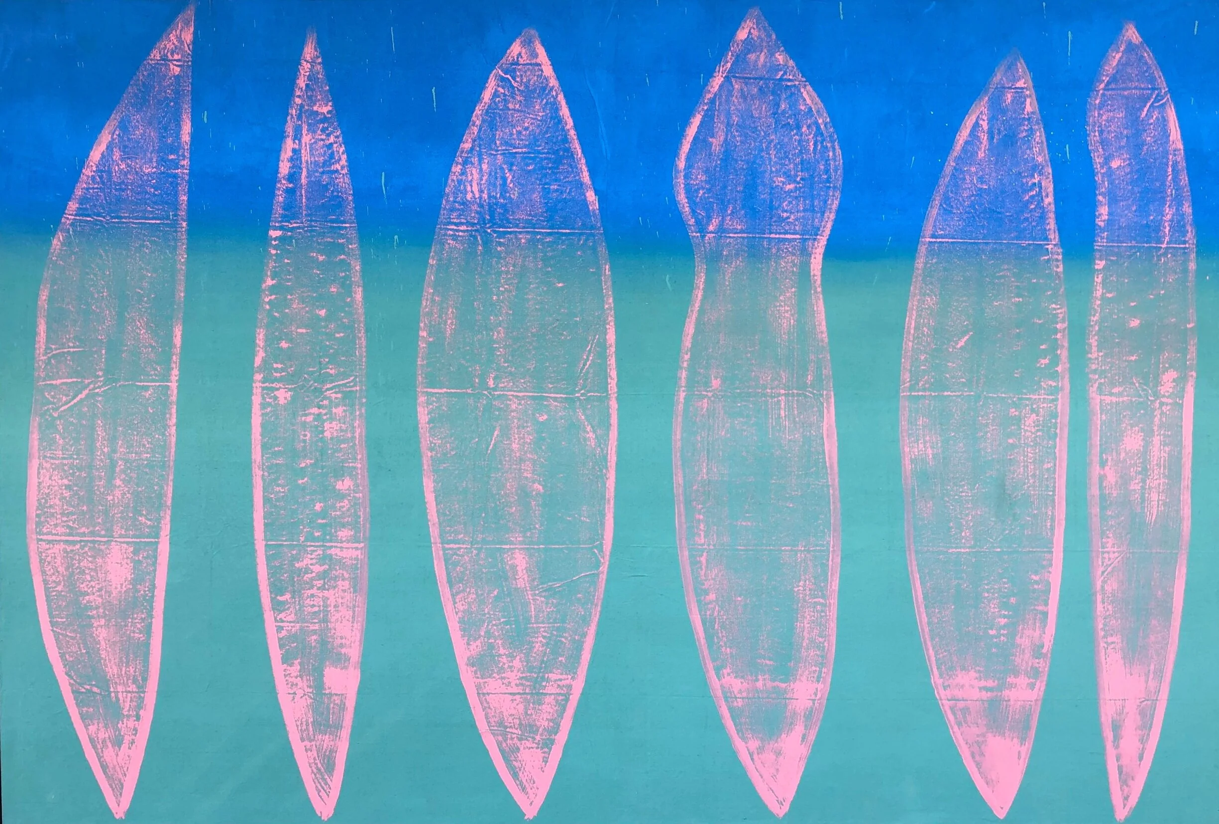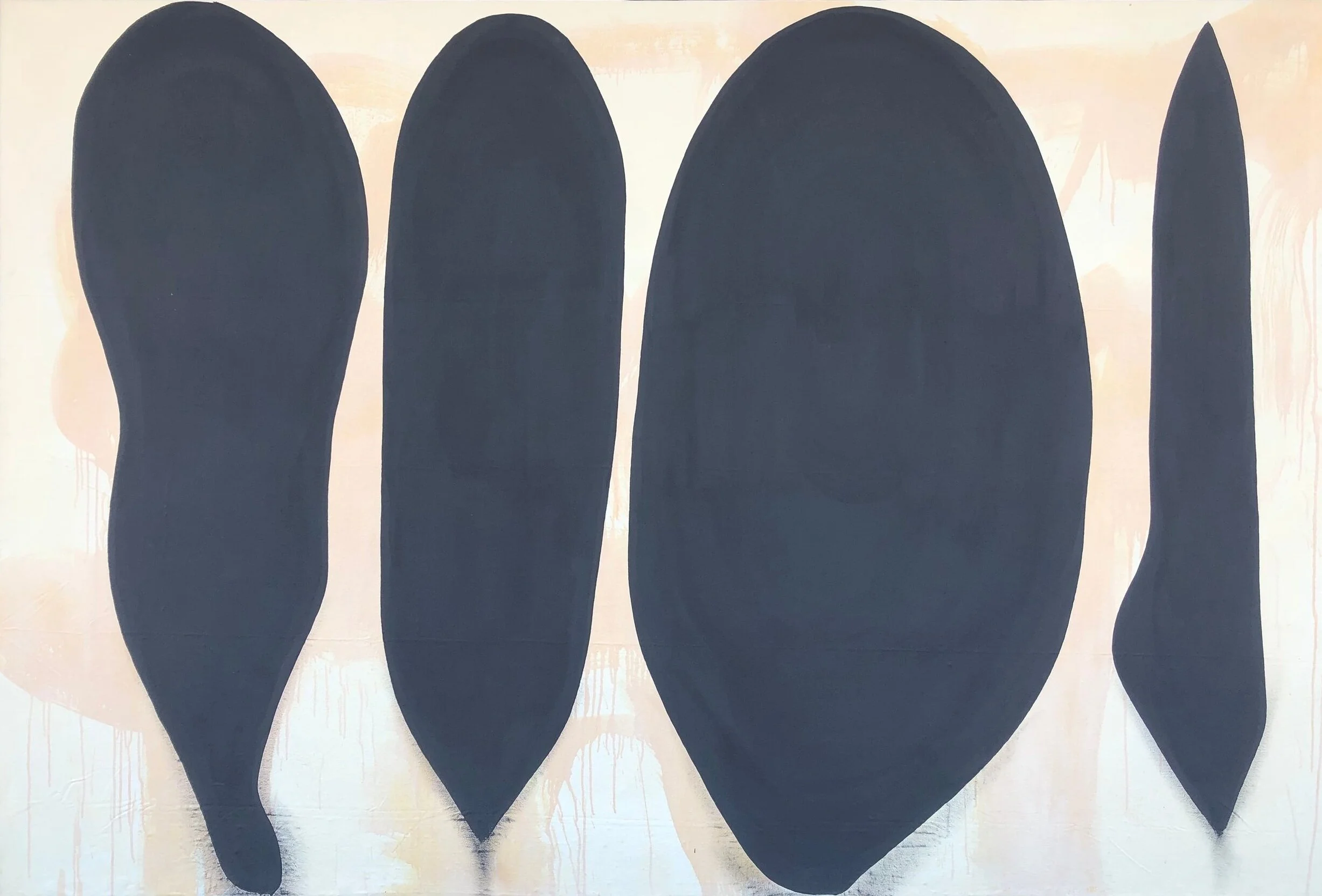 His recent paintings explore a visual language inspired by marine shapes and their contexts - particularly vernacular shapes indicative of water and terrestrial forms. Investigations into these forms derive from a variety of sources, specifically originating from his childhood experiences living near the ocean.